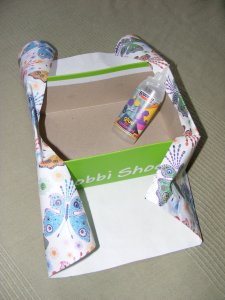 A csomagolás azonban saját készítésű. Gyerek cipős dobozok alsó felét csomagolópapírral vontam be Pentart kartonragasztó segítségével. A tetejére fehér rajzlap és a csomagolópapírból kivágott pillangó került. Végül körülkötöttem fehér szalaggal.