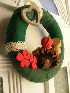 Erre a zöld alapra ragasztottam fel a díszeket kétoldalas ragasztóval és ragasztópisztollyal. (Most nem ugrált körülöttem kiskorú.) Azt hiszem, kijelenthetem, hogy a koszorú újrahasznosított alapanyagokból készült, ha nem is a szó legszorosabb értelmében. Az alap volt már ajtódísz és adventi koszorú is, az anyagok maradékok, a süniről már volt szó, a hátán az alma pirosra-sárgára festett dió fogpiszkálószárral, a gomba valaha dugóként funkcionált, a virágok az azóta köreinkből eltávozott dísztökről került át ide, a csipkeszalag a csomagolásból maradt, a szívecske pedig egy szobanövény díszeként érkezett háztartásunkba.