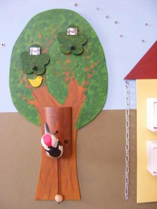 A kerítésen fakopáncsos babakocsiláncból kinyert (a lyukakat ki kellett tágítani fafúróval) fagolyók és karnisról maradt függönykarikák mozgathatók.