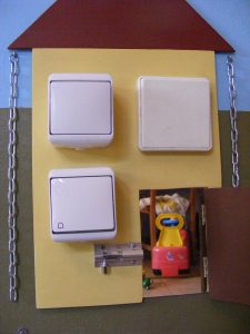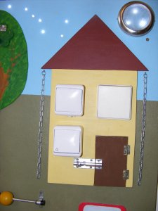 A ház előtt álló autó kerekei pörgethetők, lámpája a ház csengős billenőkapcsolójával felkapcsolható.