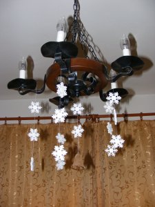 Az őszi függő mintájára télit is készítettem. A hobby boltban vettem hópelyheket. Meg nem mondom, milyen anyagból vannak, leginkább a hungarocellhez hasonlít. Sajnos könnyen törik – a legkisebben egyet alaposan szétmorzsolt…., de csinos:) A középsők alá egy Pentart akrillal bronzra festett falap csengettyűt is kötöttem.