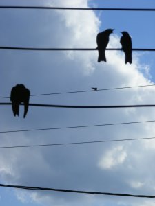 Elkészült a madaras díszítés első felvonása. Már napok óta várom, hogy az igazi drótokon is csücsüljön néhány galamb, mert szoktak. De Murphy miatt most nem akaródznak idetolni a tollas hátsójukat. De ami késik…