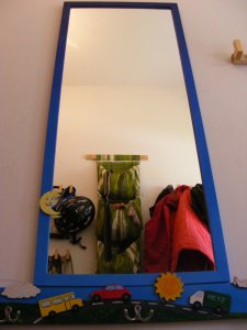 A fogas már nem mai darab. Egy fenyőkeretes IKEA tükör lóg felette (ha jól tudom, már nem kapható), ezt festettem mostnában kékre, de úgy, hogy alulról felfelé sötétedik a színe, minha a fogas ege folytatódna. Középső fiam szeptemberben óvodás lett, és a repülő jelet választotta, ami a fogason is szerepel. Nagyfiam szerette volna, ha az övé is felkerül (szerencsére nem perec vagy szék a jele:) ). így a megtoldott égre felkerült a hold.