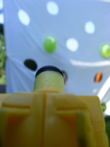 Egy lepedőre lyukakat vágtam, ezekbe zöld lufikat helyeztünk, melyeket NERFfel kellett lelőni. (Ha megint kelleni fog ez a játék valahol, festek rá várat a disznóknak, de erre most nem maradt kapacitás, pedig már láttam lelki szemeim előtt a végeredményt…)