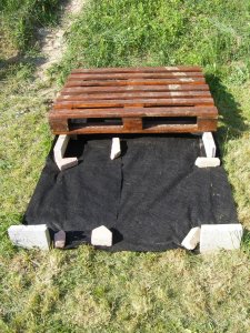 A kuckó alá dobogót építettem. Ez volt a nagyobb meló. Ha még egyszer kezdeném, tuti nem festenék le két raklapot. Nem is tudom, hogy hogyan csinálják, akik raklapból készítenek bútorokat. Meglehetősen macerás a festésük: az a sok él, meg belsőoldal… A két raklapra méretre vágott OSB lapot fektettem, amit szintén lefestettem és az aljára kátránypapírt tűztem, hogy tartósabb legyen, ne rohadjon alulról.