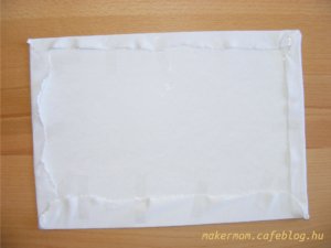 3. Méretre vágás. Ehhez a kartonra igazítottam a póló kivágott elejét, és hátul, két átellenes ponton (a keret tét hosszabbik oldalán) rögzítettem celluxszal. Először a két szabadom maradó végét vágtam méretre, majd a két rögzített oldalt úgy, hogy egyszerre egy rögzítést szüntettem meg, a másik mindig a helyén tartotta az anyagot. A sarkakat levágtam, hogy behajtás után ne púposodjanak fel a kép hátának a sarkai.