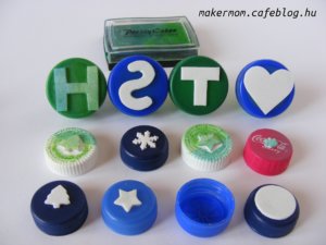 A mintákat kivágtuk vagy lyukasztottuk, a hátukra kétoldalas ragasztót tettünk, és körbevágtuk (az apróbb mintáknál erőst szenvedtem egy idő után). Fontos, hogy NE homorú kupakot válasszunk, mert akkor kerete lesz a nyomdázott mintának, mivel le fog érni a széle a kupaknak. Persze ha szeretnénk neki szép keretet, akkor pl. a recés szélű tejeskupak tökéletes választás. Fogantyúnak csőrös kupakokat ragasztottunk ragasztópisztollyal a nagyobb kupakokba és felezett parafadugót a kisebbekbe (ezeket kicsit meg kellett faragni, hogy jól illeszkedjenek. Az 1-es Nagyfian készítette teljesen SK, és a kisebb mintákat is ő nyomta ki és ragasztotta fel, miután körbevágtam a ragasztószalagot.