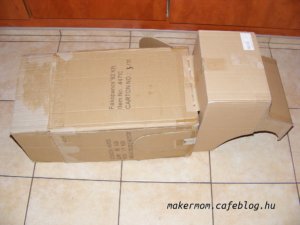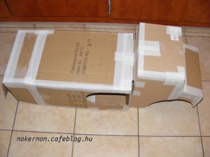 Ilyen jelmezt nem találtam a neten (a másik kettőhöz akadnak képek és videók is) így az egyik Optimus Prime-osat vettem alapul. Először két dobozból elkészítettem az alapot. A kettőt először összeragasztottam, majd spárgával “összevarrtam”, hogy bírja a gyűrődést. (Miután a csövek is felkerültek rá, elég fejnehéz lett, így nagyon jól jött ez az erős rögzítés. A fedő ragasztó így is elvált kicsit.)