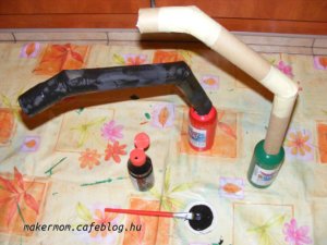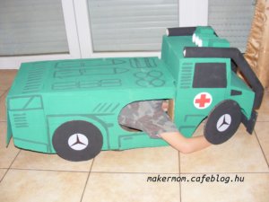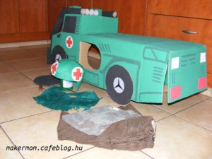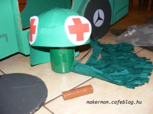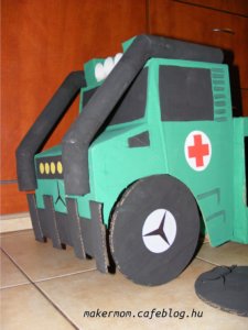 A részletek nagyon feldobták az összképet. Nurofenes dobozt és WC papír gurigákat ragasztottam a tetejére, papírcsőből készült a bukó/gallytörő felső része, az alsó része és a kerekek kartonból.