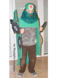 A sisakot kartonból készítettem, a szakállat anyagmaradékokból olyan módon, hogy kivágtam a szakáll formáját, majd 4-5 cm-es csíkokat varrtam rá egymás alá, melyeket bevagdostam, végül az egészre varrtam egy gumit. Elengedhetetlen kellék a töltényhüvely: egy régi ajakbalzsamot vontam be szigetelőszalaggal.