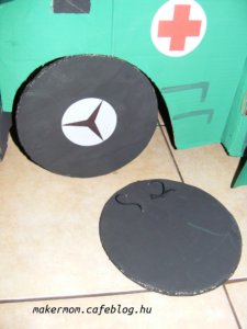 Az első kerekek Nagyfiam csuklójára kerültek, ezért kalapgumit fűztem beléjük és ragasztottam rájuk még egy réteg kartont, így egyrészt nem látszik kívülről a gumi, másrészt masszívabb a kerék.