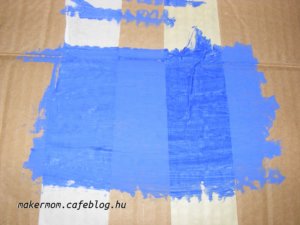 Először arra gondoltam, hogy színes kartonnal vonom be, de végül arra jutottam, hogy gyorsabb, ha festem. Ehhez azonban arra volt szükség, hogy a ragasztószalagot el kellett fednem festhető maszkolószalaggal. Először azonban teszteltem, hogy a kartonon és a szalagon milyen színű lesz a festék, amikor megszárad. Kétféle szalagot találtam itthon, egy sötétebb és egy világosabb színűt. Kiderült, hogy a sötétebben egészen már színt kapok, így aztán reméltem, hogy elég lesz a világos, mert a boltban csak a sötétebbet találtam.