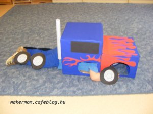 A farsang reggelén készültek az utolsó simítások, és kutyafuttában a képek. Ezért elnézést kérek. Lehetne még hová fokozni, pl. a kamion tetejére és a robot hasára mintát tenni, vagy az oldalsó ablakok köré szürke keretet, de azt hiszem, az már sosem készül el…