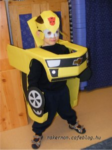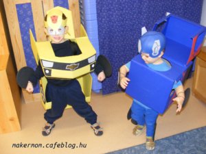 A szép az egészben, hogy megfelelő ruhára is szüksége van a gyerkőcnek. Lehetett volna fokozni sárga rátétekkel, nekünk maradt a sima fekete. (Mindig az a fránya idő…) A büszke tulajdonossal az oviban pedig így festett a jelmez robot módban: