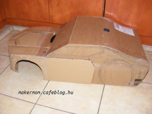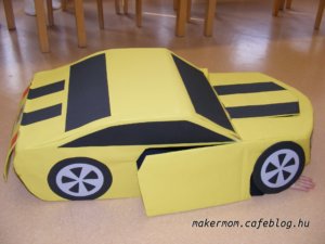 A első nagy kihívást a karton autó teste jelentette. Pinteresten és google-n megnéztem jópár képet és videót, mielőtt belevágtam. Fogtam két dobozt és felrajzoltam rájuk oldalról az autó vonalát, és nekiestem a késsel. Kétoldalt kivágtam a felesleges részeket, majd a tetejét hozzá hajlítottam és összeragasztottam ragasztószalaggal. A motorháztetőt, mivel nyílni és csukódni fog, megerősítettem egy plusz réteg kartonnal, az ajtót pedig egy fix kartonra cseréltem, hogy stabil legyen, mert eredetileg a közepén húzódott a doboz tetejének ill. aljának a ragasztott illesztése. Ezt később még egy keskenyebb (kb. 3 cm széles) kartoncsíkkal is megerősítettem, mivel a tesztelések során kiderült, hogy így nincs elég tartása. A következő fejtörést az okozta, hogyan fog ez megállni aKözépsőmön? … Valamelyik videóban láttam, hogy hátizsák-szerűen van a gyerek hátán a jelmez, így széles fekete szalagból pántokat fűztem a kartonba, ez tartja a háton az autót.